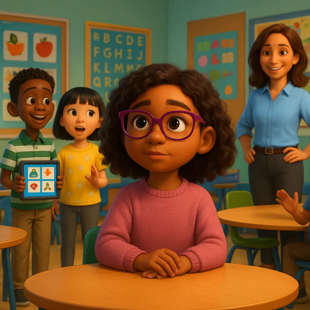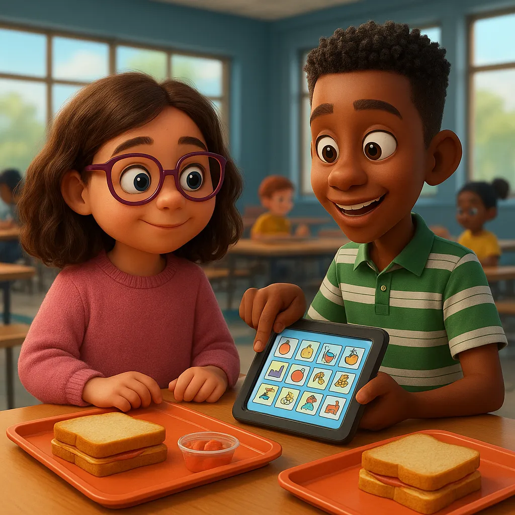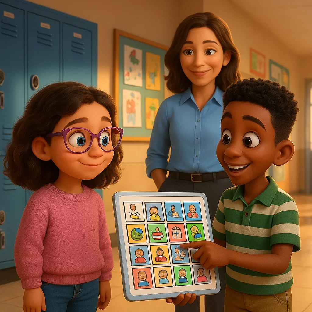 At school, kids share their thoughts in different ways. Some talk with words, some use devices, and others use their hands to show what they mean.