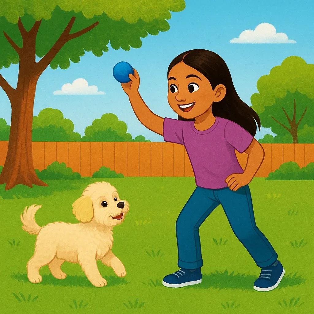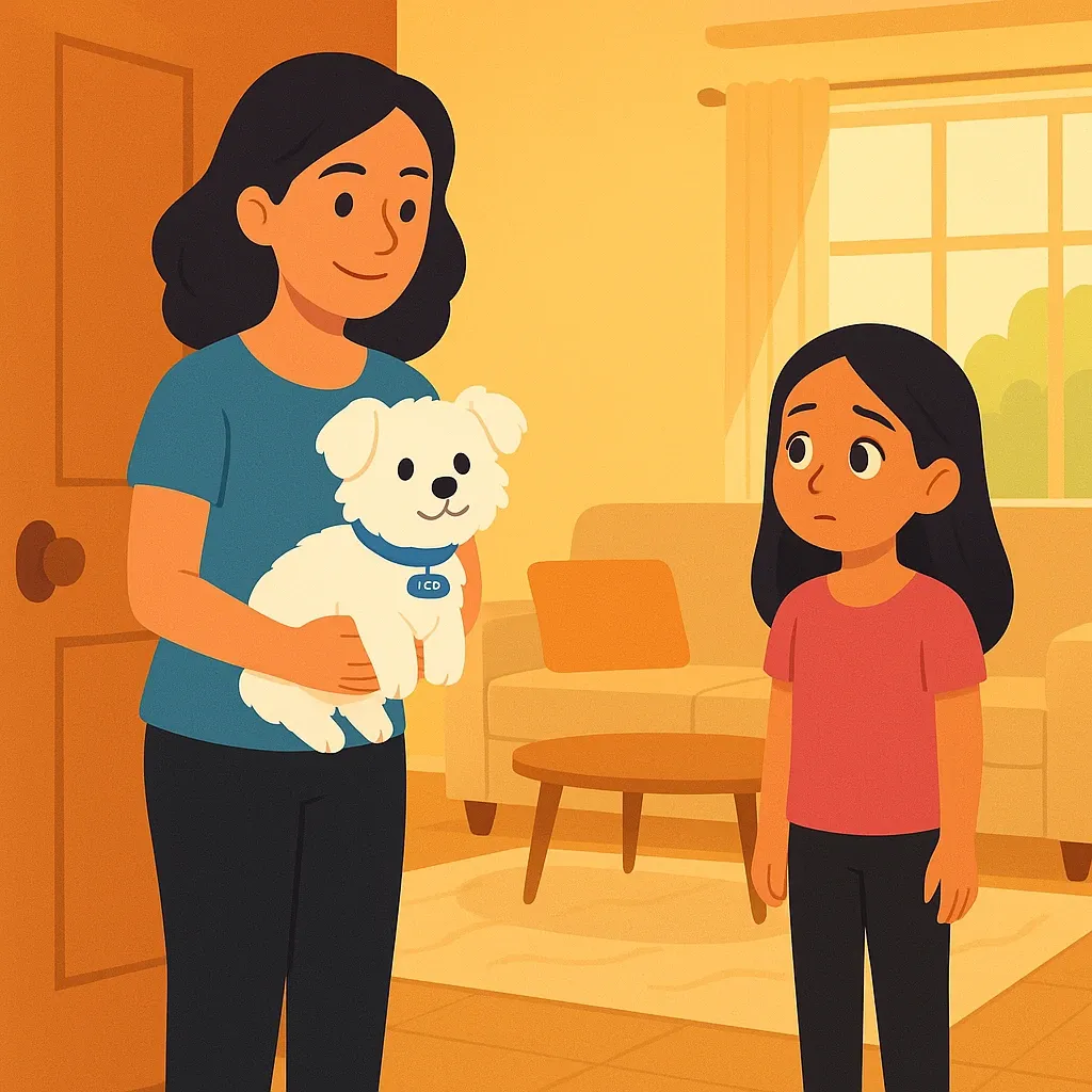 Mom brought home a small teddy bear dog named Leo. Leo has soft white fur and likes to sniff everything in his new home.