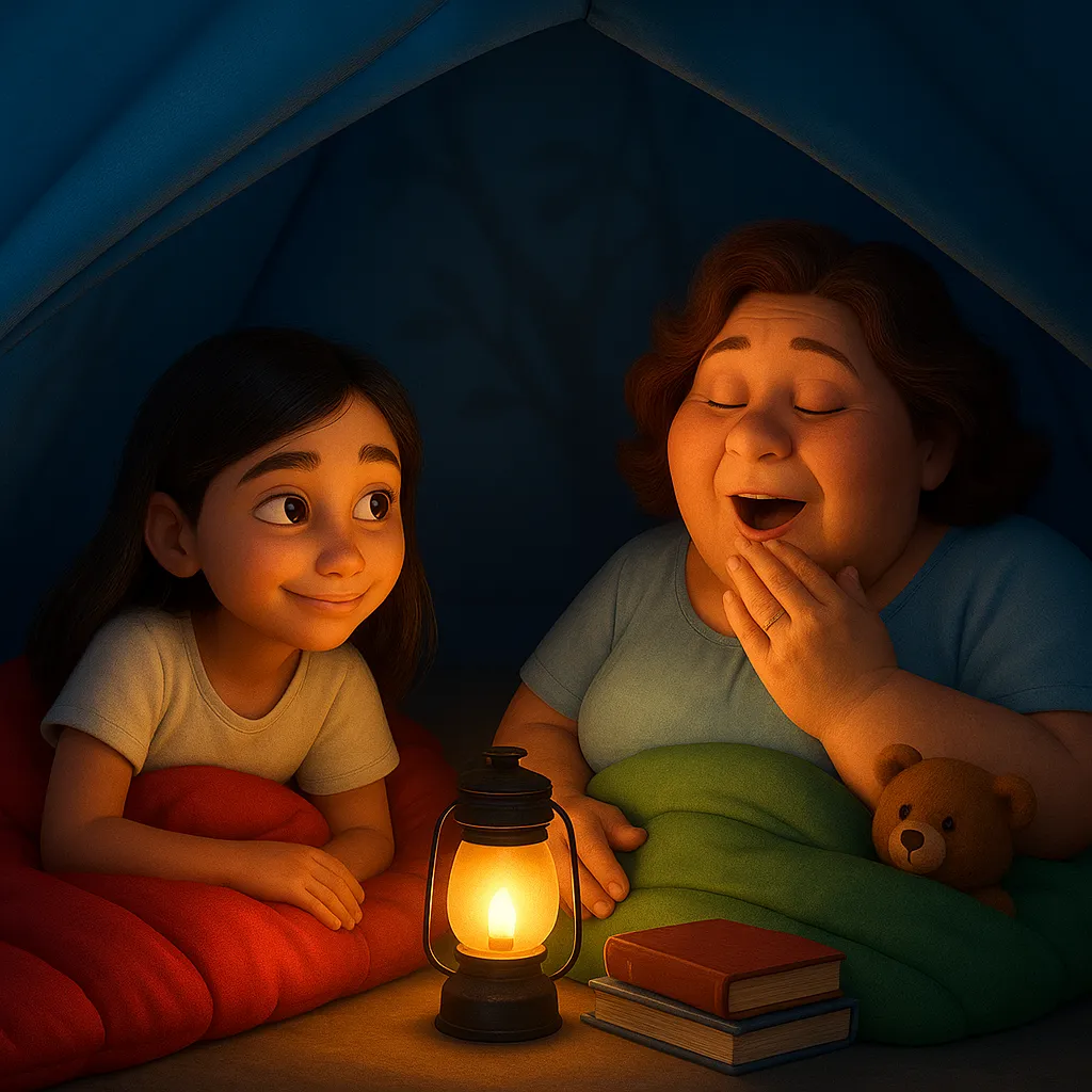 Noella and Abby are going camping together in the forest. They packed their tent, sleeping bags, and snacks for their outdoor adventure.