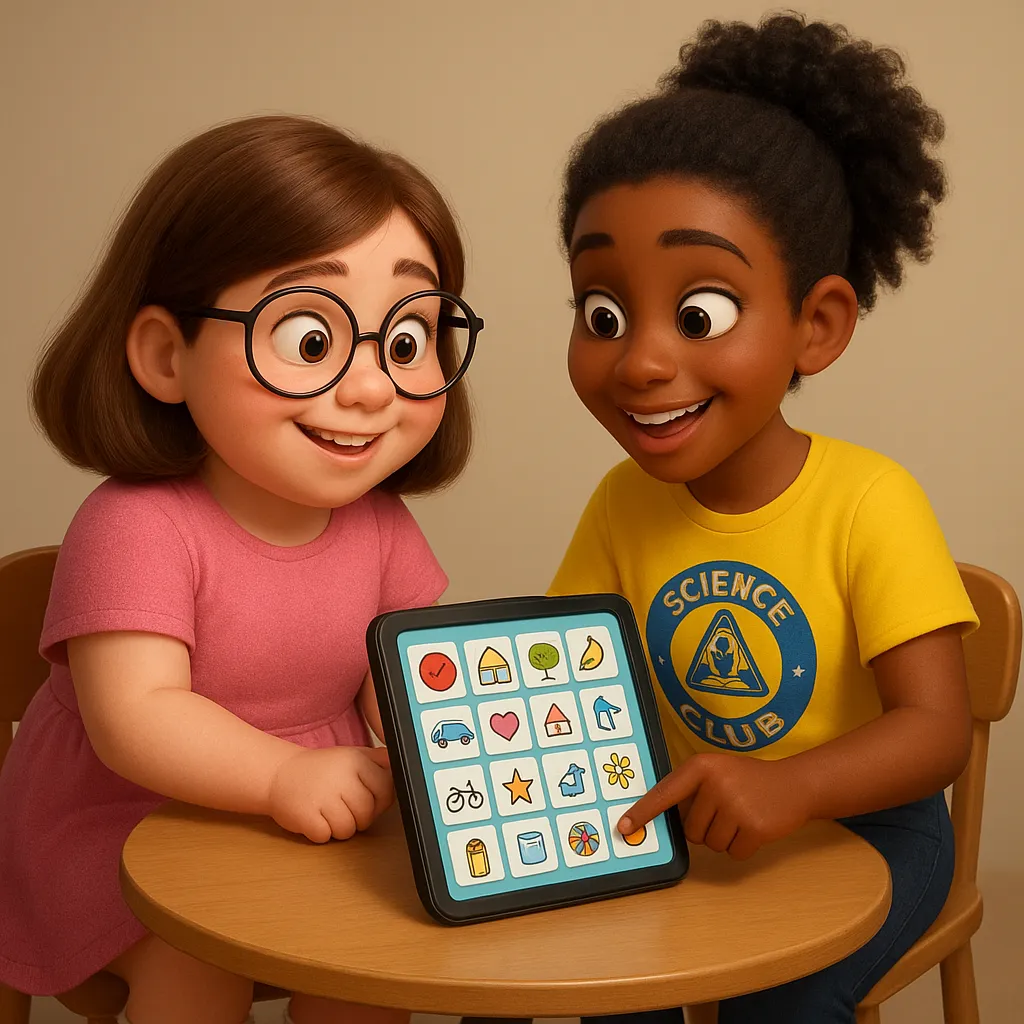 Friends can talk in many ways. Some friends use their voice to speak words. Other friends might use a tablet or special device with pictures to share their thoughts.