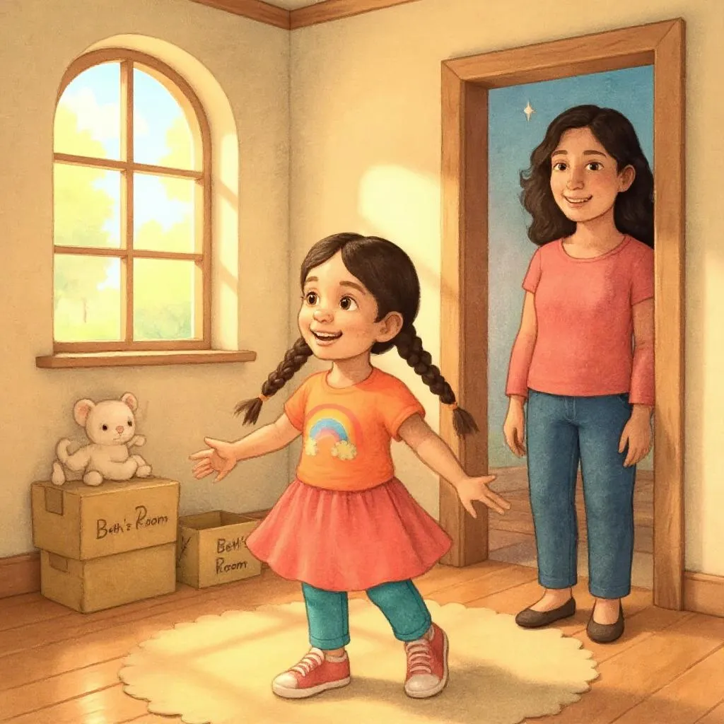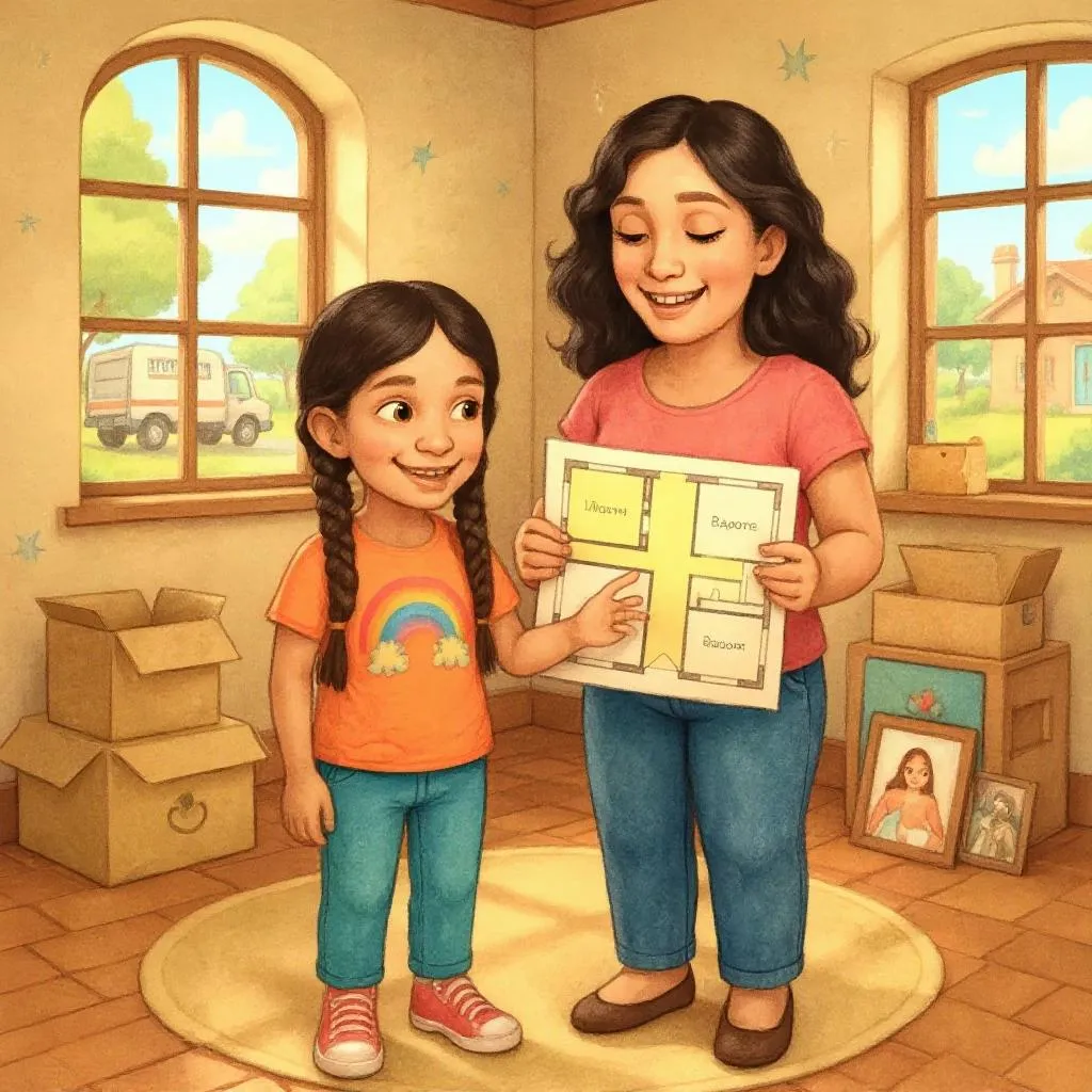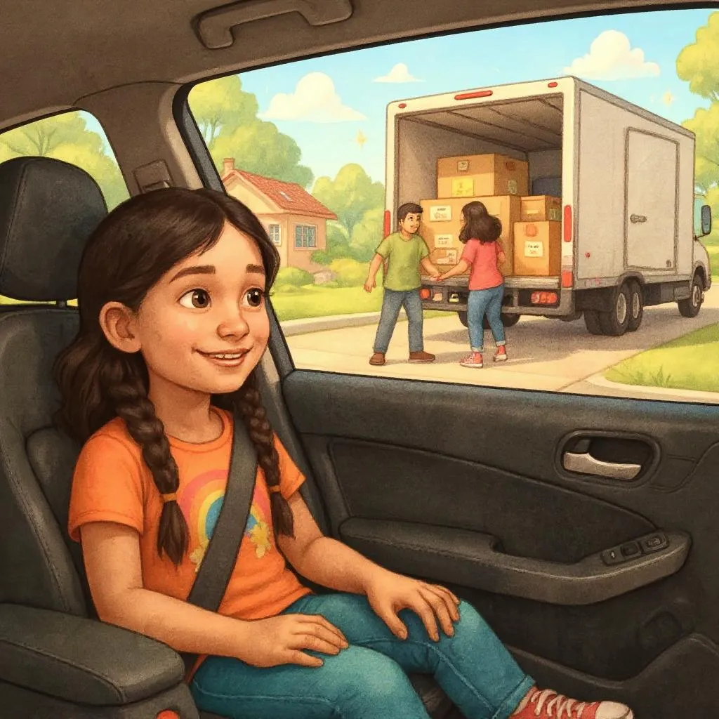 Moving means my family will live in a different house with new rooms for me to explore. I will have a new bedroom, a new bathroom, and maybe even a new backyard. My family will still be with me, but our home will be in a new place.